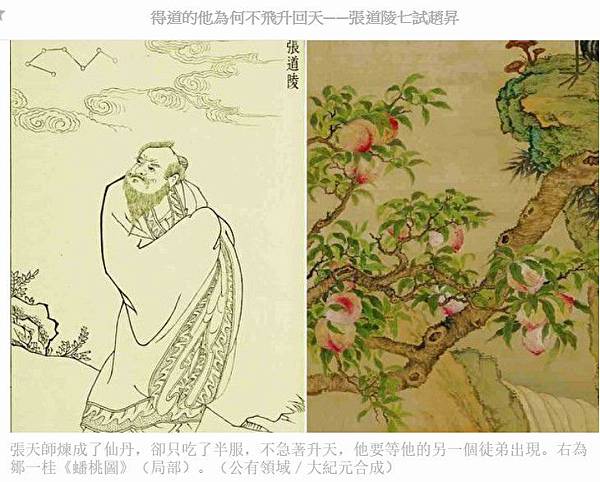張天師煉成了仙丹,卻只吃了半服,不急著升天,他要等他的另一個徒弟出現。右為鄒一桂《蟠桃圖》(局部)。(公有領域/大紀元合成)