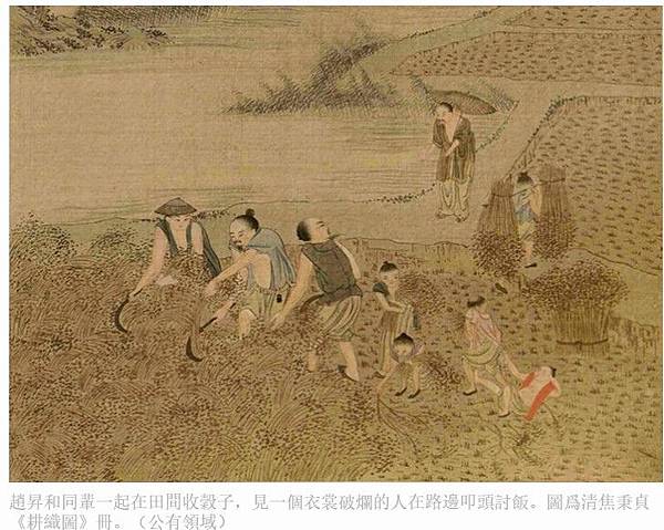 趙昇和同輩一起在田間收穀子,見一個衣裳破爛的人在路邊叩頭討飯。圖爲清焦秉貞《耕織圖》冊。(公有領域)