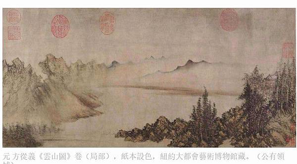 元 方從義《雲山圖》卷(局部),紙本設色,紐約大都會藝術博物館藏。(公有領域)