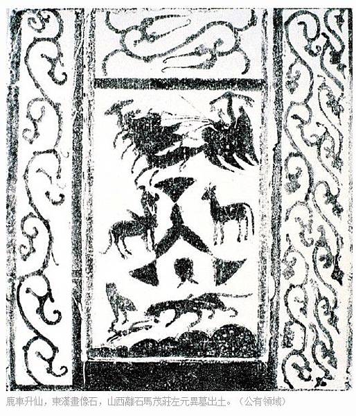 鹿車升仙,東漢畫像石,山西離石馬茂莊左元異墓出土。(公有領域)