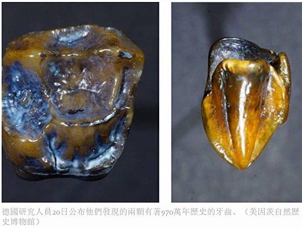 其實這兩顆牙齒是一年前發掘到的,但直到今天,德國研究人員才有信心公布於眾,並表示是970萬前遺留下來的。
