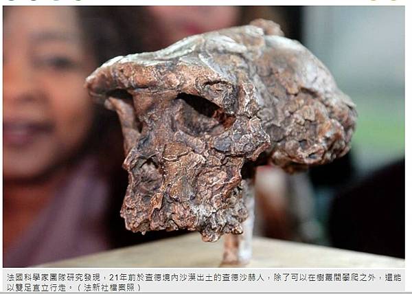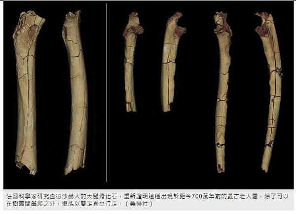 法國科學家研究查德沙赫人的大腿骨化石,重新證明這種出現於距今700萬年前的最古老人屬,除了可以在樹叢間攀爬之外,還能以雙足直立行走。(美聯社)