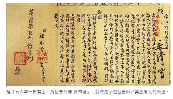 蔣介石大筆一揮寫上「黃溫恭死刑 餘如擬」,就決定了這位醫師及其全家人的命運。