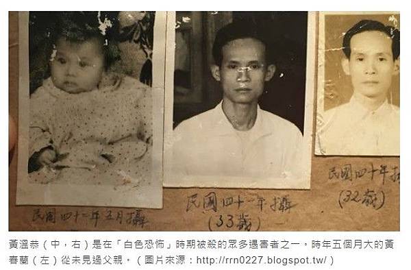 黃溫恭(中,右)是在「白色恐怖」時期被殺的眾多遇害者之一。時年五個月大的黃春蘭(左)從未見過父親。(圖片來源:http://rrn0227.blogspot.tw/)