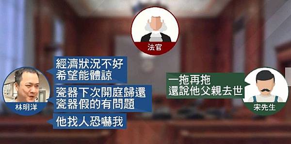 出面指控林明洋從兩年前,拿了他6件古董瓷器說可以代為轉售,沒想到給了本票4000萬後,人就消失,本票也無法兌現,氣的宋先生直接提告,在法庭上,林明洋向法官說,目前自己的經濟狀況很不好,希望對方能夠體諒,瓷器會在下次開庭當面歸還,還反稱說是對方的瓷器有問題,遲遲不願歸還,是因為對方有找人恐嚇讓他心生恐懼。