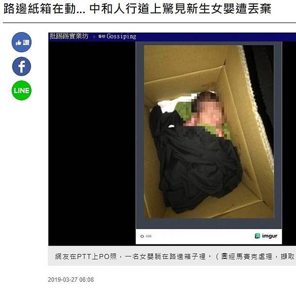 有網友在PTT上PO照,照片中一名女嬰躺在箱子裡,網友透露,朋友的爸爸在「四平街公園」附近抓寶,想說草叢怎麼有箱子在動,結果打開一看就看到...。網友說女嬰「奄奄一息的在紙箱裡,臍帶也沒斷,也沒包東西,還好當下沒有野狗靠近,XX媽的良心被狗啃了是嗎...」