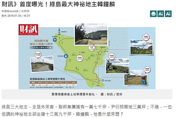 韓鐘麟對《財訊》說:「整個柚子湖是我的,我買得乾乾淨淨一筆都不剩,地共有101筆」。全綠島70%的沙灘緊鄰韓的地!