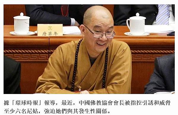 據「環球時報」報導,最近,中國佛教協會會長被指控引誘和威脅至少六名尼姑,強迫她們與其發生性關係。