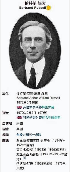 伯特蘭·亞瑟·威廉·羅素,第三代羅素伯爵(英語:Bertrand Arthur William Russell, 3rd Earl Russell,1872年5月18日-1970年2月2日),OM,FRS,英國哲學家、數學家和邏輯學家,致力於哲學的大眾化、普及化。[2] 伯特蘭·羅素 - 維基百科,自由的百科全書 - https://goo.gl/GwPYwk