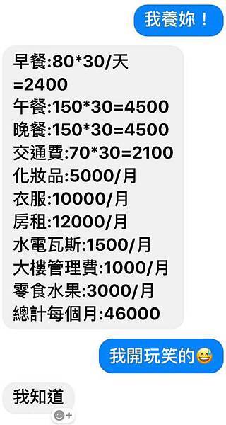 該名男網友在臉書「爆廢公社」 po 出和女方的對話截圖,只見原 po 霸氣喊出「我養妳」三個字,女方則冷靜地列出整個月的基本開銷表,包括三餐、交通費、化妝品、衣服、房租、水電瓦斯、大樓管理費及零食水果等費用,每月要 46000 元,讓原 po 當場退縮說「我開玩笑的」,對方也回應「我知道」。