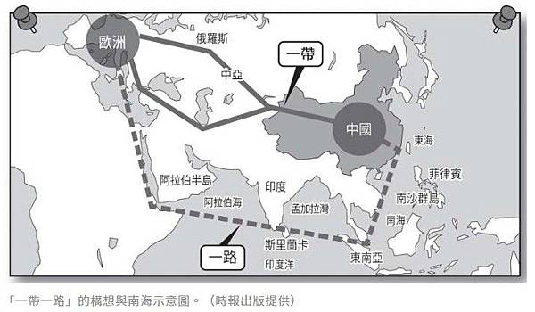 「一帶一路」的構想與南海示意圖。(時報出版提供)