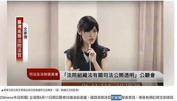 [NOWnews今日新聞] 立法院6月11日開公聽會討論法庭直播,邀請高院法官文家倩發表意見,事後有網紅將文家倩與民眾黨立委黃國昌的發言片段剪成影片並下標「神仙打架!民進黨派出高等法院美女法官辯論!黃國昌正面對決!實力輾壓!全場燃爆!」,上傳至今已有80萬點擊、6千多則留言,不少網友批評文家倩毫不手軟,例如「我不知道什麼高等法官,但我知道什麼是低級言論」、「這個女的不適合當法官,適合當演員」、「這位女法官,不食人間煙火的恐龍法官」。中華民國法官協會對此聲明,法官在立法院公聽會的發言,並未與特定人士針鋒相對,卻遭到媒體不當剪輯下標。