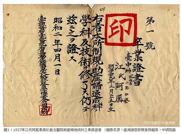 因日籍護士與臺籍病患之間的語言隔閡,1907年臺灣總督府接受臺北醫院院長的建議,制定〈助產婦講習生規程〉,規定臺北醫院除培養日籍產婆的本科之外,另以公費招募臺籍女性,設置培養臺籍產婆的速成科,修業期限為一年。1923年10月,總督府將看護婦與助產婦的訓練規程統一,並合併看護婦及助產婦講習所,而分置看護婦科與助產婦科。其中,助產婦講習仍以日、臺籍區分,分為本科與速成科,其修業年限略有差別,即區分為2年、1年。圖1即為江氏阿鳳畢業於臺北醫院看護婦、助產婦講習所助產婦速成科的畢業證書。