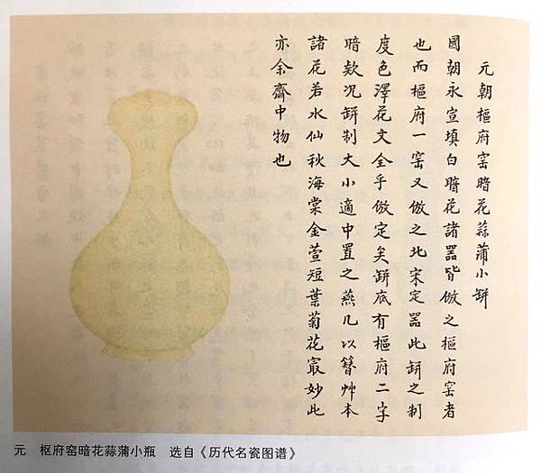 原文:養花瓶亦須精良。譬如玉環、飛燕,不可置之茅茨;又如嵇、阮、賀、李,不可請之酒食店中。嘗見江南人家所藏舊觚,青翠入骨,砂斑垤起,可謂花之金屋。其次官、哥、象、定等窯,細媚滋潤,皆花神之精舍也。大抵齋瓶宜矮而小,銅器如花觚、銅觶、尊罍、方漢壺、素溫壺、匾壺,窯器如紙槌、鵝頸、茄袋、花樽、花囊、蓍草、蒲槌,皆須形制短小者,方入清供。不然,與家堂香火何異,雖舊亦谷也。然花形自有大小,如牡丹、芍藥、蓮花、形質既大,不在此限。嘗聞古銅器入土年久,受土氣深,用以養花,花色鮮明如枝頭,開速而謝遲,就瓶結實,陶器亦然,故知瓶之寶古者,非獨以玩。然寒微之士,無從致此,但得宣、成等窯磁瓶各一二枚,亦可謂乞兒暴富也。冬花宜用錫管,北地天寒,凍冰能裂銅,不獨磁民。水中投硫磺數錢亦得。