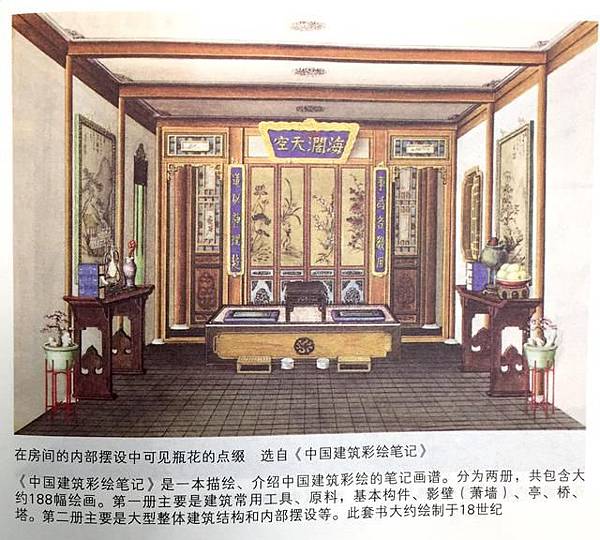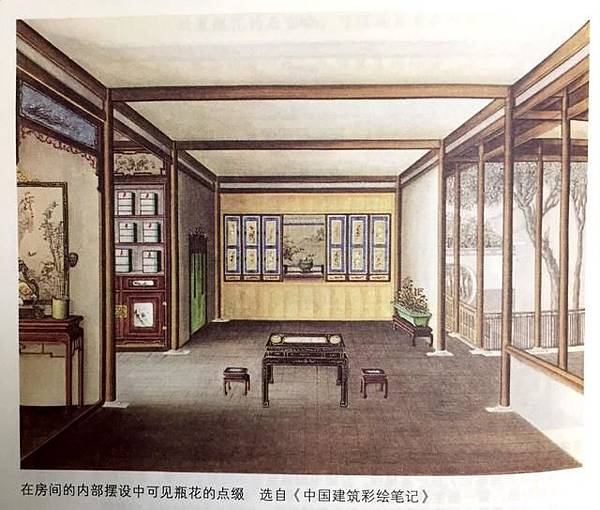 譯文:有插花的房間,可擺放具有天然風味的几案一隻,藤製的床一個。几案最好是厚重寬大、光滑細膩。凡屬本地有邊欄的漆桌、鑲有貝殼畫的描金床,以及有彩色圖案的瓶架等富麗繁複的家具,均不宜與插花布置在同一室內。(插花乃是雅事,一俗入眼,則盡俗矣,故摒之。)