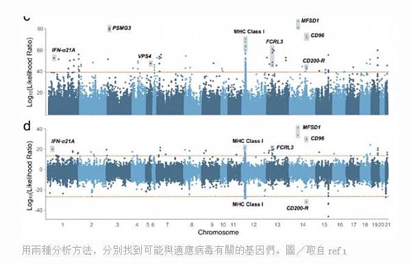 用兩種分析方法,分別找到可能與適應病毒有關的基因們。圖/取自 ref 1