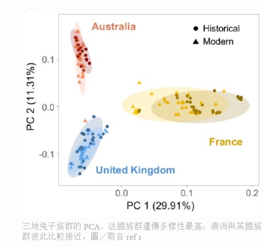 三地兔子族群的 PCA,法國族群遺傳多樣性最高,澳洲與英國族群彼此比較接近。圖/取自 ref 1