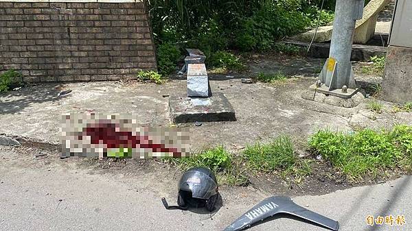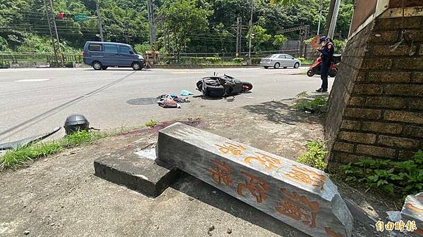 騎士被貨車撞擊後,直接彈飛,撞倒路旁石柱。(記者吳昇儒攝)