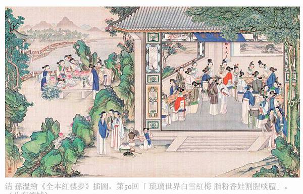 清 孫溫繪《全本紅樓夢》插圖,第50回「 琉璃世界白雪紅梅 脂粉香娃割腥啖膻」。(公有領域)