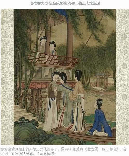 寶婺生看見船上的新娘正式他的妻子。圖為清 焦秉貞 《仕女圖.蓮舟晚泊》,台北國立故宮博物院藏。(公有領域)