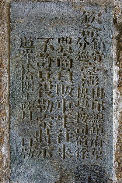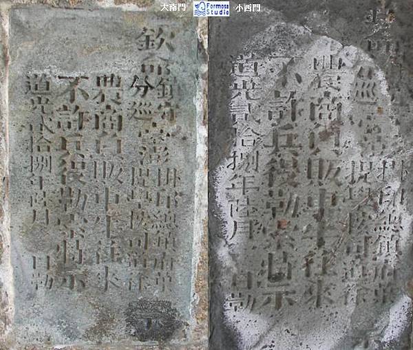 大南門- 【台南- 中西區】 城門內有一個道光二十八年六月所頒布的禁止守城兵士勒索碑,上頭寫著:「欽命鎮守臺澎掛印總鎮府葉 分巡 提學按司道徐 示 農商負販,車牛往來, 不許兵役勒索,特示。 道光貳拾捌年陸月日勒。」- https://goo.gl/49hcDK