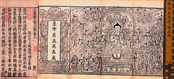 教主釋迦牟尼說經圖西元十三世紀/湖州(浙江吳興)版畫/大集譬喻王經卷首扉畫隋釋闍那崛多譯/宋刊湖州思溪藏經本元朝皇室信仰藏傳佛教,元代雕印的佛經除了西夏文的《河西字大藏經》以外,漢文大藏經如《磧砂藏》《普寧藏》,都有西夏僧人管主八參與編修;所以元朝的藏經扉畫,受到西夏與西藏佛教藝術的影響,流露出強烈的「西藏~尼泊爾」風格