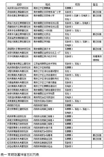 表格基本信息參考《江蘇考古五十年》第287頁。獅子沖石刻原定為「陳文帝永寧陵」,對應的兩座墓葬經考古發掘後,墓主確認為梁昭明太子蕭統及其生母丁貴嬪,蕭統雖未登基為帝,然而其墓葬規模及墓前石刻均與帝陵相同,表中信息據此更改。其餘石刻定名均以國家文物局頒布的文保碑為準。