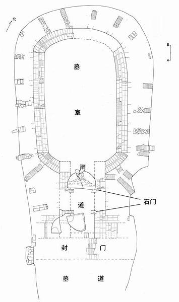 根據考古調查、發掘資料,南朝陵墓大多具有以下特點:墓地選擇十分注重「風水」,多選擇背依山崗、面臨平地、兩側山隴延伸的緩坡地帶營建墓葬。墓葬均為平面呈「凸」字形的大型單室磚墓,帝後級墓甬道內設兩重石門,王侯級墓甬道內設一重石門,墓室平面為長方形或近橢圓形。墓室內裝飾華麗的花紋磚或大幅磚印壁畫,壁畫題材包括「日」、「月」、 「獅子」、「宿衛武士」、「朱雀」、「玄武」、「羽人戲龍」、「羽人戲虎」、「竹林七賢與榮啟期」、「車馬出行」等。由於南方地濕,為防止墓內積水,墓室內部通常設有排水系統,排水溝往往延伸到墓室之外幾十米甚至數百米遠的低洼之地或水塘。結合考古發現和相關文獻記載,墓葬營建過程大致可以復原為:選擇墓地,平整坡面,開挖墓坑,營造磚室,葬入死者,封門填埋,安放石刻。