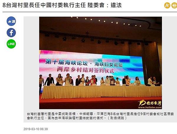 8台灣村里長任中國村委執行主任 陸委會:違法到Facebook 分享8台灣村里長任中國村委執行主任 陸委會:違法到Line
