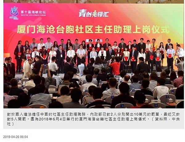 中國廈門市海滄區去年招聘35位台灣人擔任社區主任助理,主管的內政部認定,社區主任助理類似我村里幹事,屬中國政府職務,前往任職者已違反「兩岸條例」中禁止在中國黨政軍任職的規定,可處10萬到50萬台幣的罰鍰。政府已掌握部分名單,將請當事人說明,至於是否開罰還要研究。