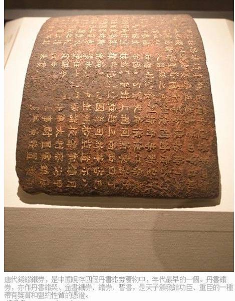 唐代錢鏐鐵券,是中國現存四個丹書鐵券實物中,年代最早的一個。丹書鐵券,亦作丹書鐵契、金書鐵券、鐵券、誓書,是天子頒發給功臣、重臣的一種帶有獎賞和盟約性質的憑證
