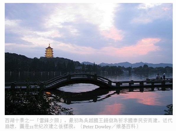 西湖十景之一「雷鋒夕照」。最初為吳越國王錢俶為祈求國泰民安而建,近代崩壞,圖是21世紀改建之後樣貌。(Peter Dowley/維基百科)