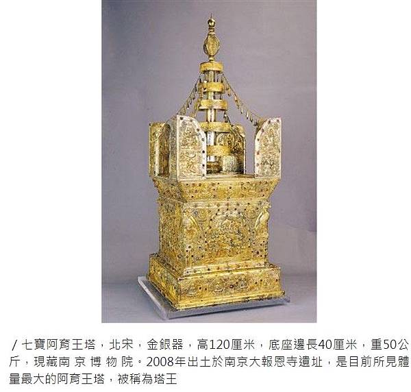 國寶級展品《銀阿育王塔》-2008年大陸城南金陵大報恩寺出土、有塔中之王美名的七寶阿育王塔+「七寶阿育王塔」,相傳是五代十國吳越最後一個國王錢弘俶於西元955年,仿效印度阿育王命人所造,高度比所有塔都高3倍,有「塔中之王」美名。+佛教7寶,金、銀、琉璃、玻璃、珊瑚、硨磲、瑪瑙為飾,表面鑲嵌452顆白、紅、藍、黑等各色寶珠,內供奉佛頂骨真身舍利等珍寶,尤其塔身四面的浮雕繪有佛陀本生故事,是迄今為止,中國出土的體型最大、製作最精美、工藝最複雜、銘文最多、最具史料價值的阿育王塔。 @ 姜朝鳳宗族 :: 痞客邦 :: - https://goo.gl/VtTpDu