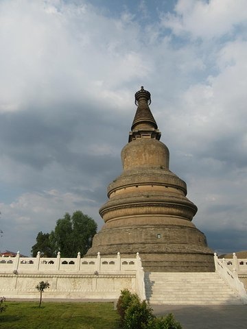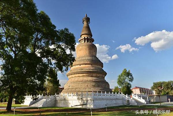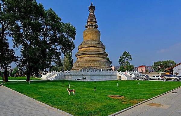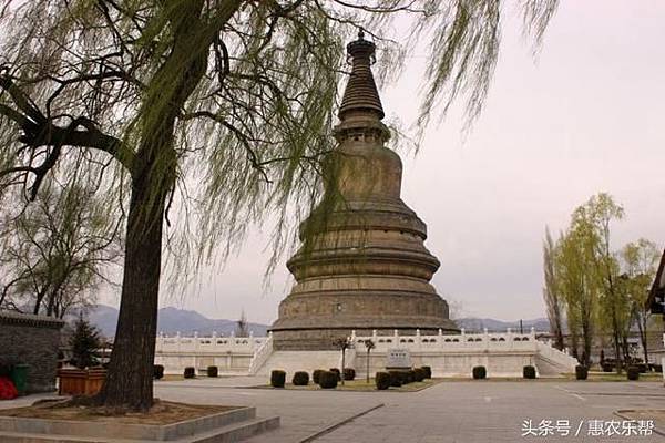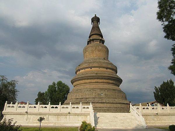 塔為圓錐體、佛教藏式造型。塔基平面為長方形,南北長50米,東西30米,高1.5米,塔建於塔基正中央。塔平面為圓形,磚砌,周長60米,高40米。作覆仰蓮瓣及重澀混肚與方澀的須彌座式,雕刻著各種花飾、荷瓣和印度的"陀羅尼經"。塔身上施曲尺形彌座,座上承剎杆。原有磚作相輪十三層,兩層已毀,上覆蓋盤,中裝金頂寶珠。造型秀美,雄健挺拔,雕藝高超,為我國藏式塔中之佳作。原文網址:https://kknews.cc/zh-tw/other/5x92ze6.html