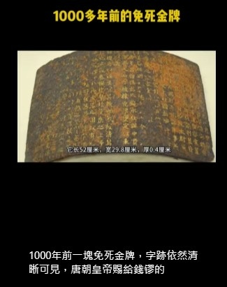 唐代錢鏐鐵券,是中國現存四個丹書鐵券實物中,年代最早的一個。丹書鐵券,亦作丹書鐵契、金書鐵券、鐵券、誓書,是天子頒發給功臣、重臣的一種帶有獎賞和盟約性質的憑證。