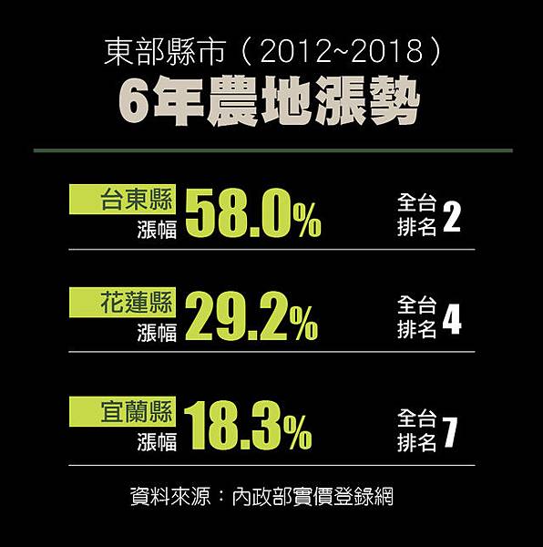 東台灣,價格漲最多的台東,6年漲58.0%;花蓮6年上漲29.2%,宜蘭則漲18.3%。不過,深入到鄉鎮,民宿多的區域,帶動價格上漲,如台東的池上、宜蘭的礁溪、花蓮的瑞穗,漲幅都超過100%;目前礁溪農地每公頃要價近8千萬元。
