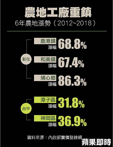 中部縣市的農地漲幅,以彰化縣的27.9%最高;進一步分析該縣26個鄉鎮,可發現農地工廠的「重鎮」鹿港、和美,分別上漲68.8%、67.4%,另一重災區埔心更漲了86.3%。台中儘管全市農地均價僅漲13.8%,但兩大農地工廠熱區潭子、神岡,6年農地各漲31.8%、36.9%,漲幅超過全台中的平均值。