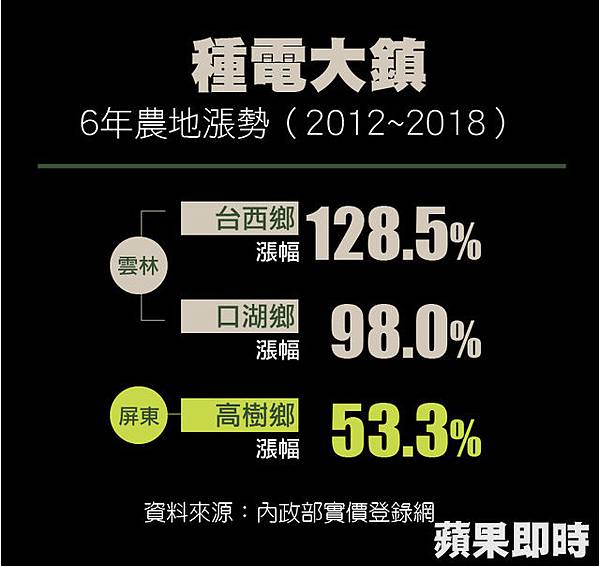 南台灣價格平穩,但屏東縣6年農地分別漲45.4%,主要是種電所致,而雲林的台西鄉、口湖鄉,因為種電,漲幅「至少」98%起跳,不過雲林縣均價約是漲18.3%。