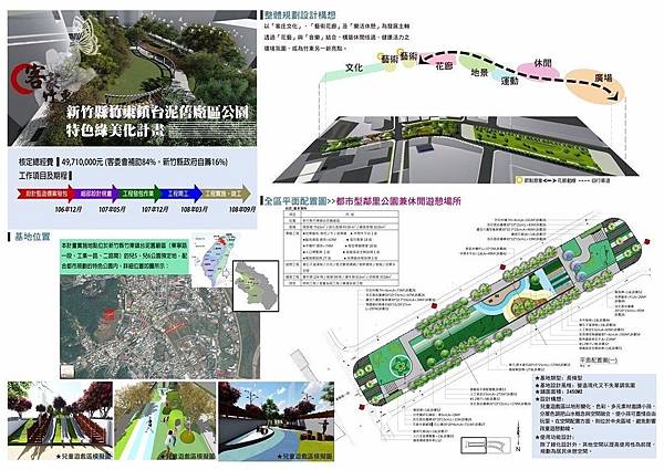 建造公司今天上午簡報指出,基地750平方公頃,綠覆面積達六成,另還設計兩座紫藤花廊道,透過生態來造景。另一方面,竹東有客家、林業、台泥等文化歷史,一旁也有科技、音樂、生態等多元因素,在打造兒五和兒六公園,工程內容包含建置藝術花廊、地景藝術、鋪面及排水工程、遊具工程、景觀及植栽工程等。
