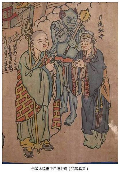 目連很早就出家修行,且功力高深。一天他用神通看見自己的母親在地獄受苦,於是來到地府要救母親。但是地獄城門嚴峻,哪裡能那麼容易攻破?這時候閻羅王告訴目連,只要能跟西天佛祖借到金錫杖,就能打開地獄門,救出他的母親。目連費了千辛萬苦終於借回錫杖,來到鬼門關前猛力一震,高大的城門瞬間崩毀,他很快救出自己的母親,但城內的所有罪魂也通通都跑出來了。