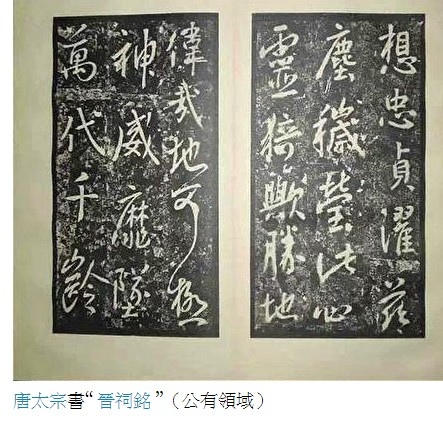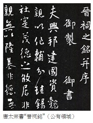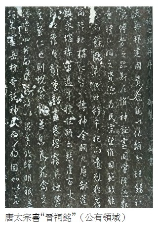 晉祠銘由太宗撰文並書,貞觀二十一年(647年)八月刻碑。此碑全文一千二百零三字,共二十八行。碑文行書體,勁秀挺拔,飛逸灑脫,骨格雄奇,刻工洗煉,可謂行書楷模。全碑之書寫得心應手,生氣勃勃,神采飛動,精氣過人,體現一代英主之氣度風采。https://goo.gl/LNo8NB