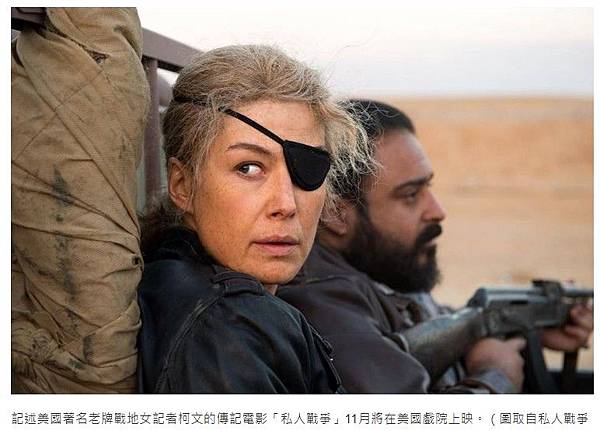 (台灣英文新聞/朱明珠 台北報導)身在戰火最前線的戰地記者瑪麗科爾文(羅莎蒙派克飾演),長期在戰亂當中奔走,即便因被戰火波及而失去左眼,仍無視當地政府對記者的禁令,走遍利比亞內戰、斯里蘭卡內戰、伊拉克戰爭、敘利亞戰爭,揭發戰火之下的真相,電影【私人戰爭】正是描寫這位傳奇女記者的傳記電影。這部被國際媒體盛讚:「本年度最有意義且扣人心弦的傑作!」已於今(4)日正式上映。