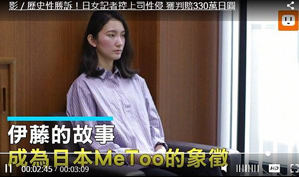日本自由記者伊藤詩織打破傳統,公開指控TBS電視台前華府支局長山口敬之對她下藥性侵,並以造成精神創傷為由,提出1100萬日圓的民事損害賠償,18日獲東京地方法院判決勝訴,山口應支付330萬日圓。 專訪伊藤詩織:希望有一天,人們會把我看作詩織本身|香港|深度|端傳媒 Initium Media