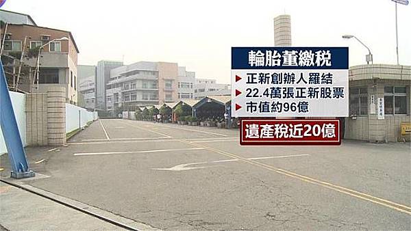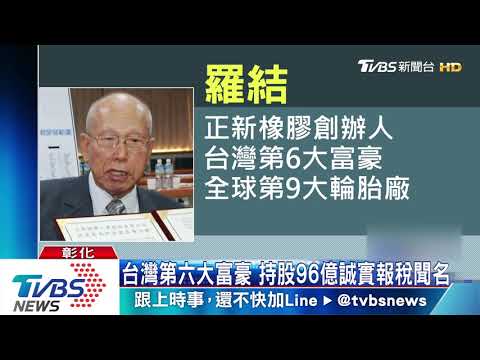 全球第九大輪胎廠正新輪胎,創辦人羅結15號辭世,享壽95歲,羅結家族總身價902億,台灣富豪榜,排名第6,根據了解,羅結過世後,留下的遺產粗估超過96億,總遺產稅高達20億,2010年他的妻子過世,繳出13億遺產稅,挹注大村鄉財政。
