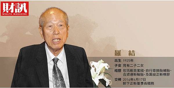 (中央社記者韋樞台北19日電)輪胎大廠正新輪胎創辦人羅結15日以95歲高齡過世,貧苦出身、僅有國小學歷的他,一手打造全球行銷超過180個國家的輪胎王國,也讓他登上富比世富豪榜。