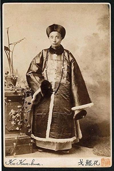 照片中提到的另一重要人物崇善,另有一張專門的「大清光緒三十一年崇佑庭七十有四小照」,其上的題名為:「尚書銜軍功花翎,福州將軍、閩海關監督、船政大臣、兼署閩浙總督、兼福建鹽政大臣、世襲奉恩將軍」。從照片上看,此公形象、風度極佳,絕非官場上那些賊眉鼠眼之輩可以同日而語。崇善以福州將軍兼任船政,時常與洋員交涉,故前述照片顯然即與此有關。崇善後因病去職,於1908年去世。是時,離清朝滅亡已為時未遠,他幸運地躲過辛亥革命,亦可謂善終。