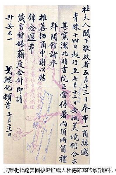戈鯤化抵達美國後給推薦人杜德維寫的致謝信札。(公有領域)