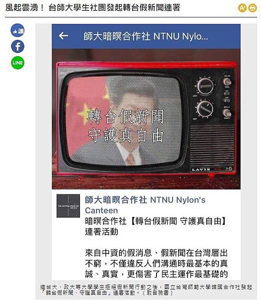 報導指出,台灣社會已提高警覺面對中國假訊息威脅,政府加強法律規範,以防謠言或不實訊息散播造成損害。臉書、Google和通訊軟體LINE等業者同意加強管理各自平台之際,政府部門與公民社會團體也繃緊神經,盡可能以最快速來闢謠。