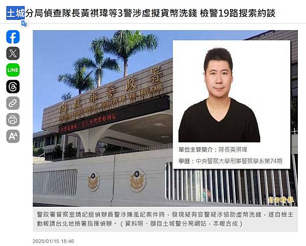 土城分局偵查隊長黃祺瑋等3警涉虛擬貨幣洗錢 檢警19路搜索約談 - 社會 - 自由時報電子報 https://bit.ly/40zBjjE