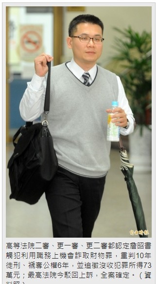〔記者張文川/台北報導〕新竹地檢署前檢察官詹昭書,任內向遭圍廠抗議的污泥廠業者謊稱他可主導法辦抗爭人士,向業者詐取73萬元;新竹地院一審判詹昭書無罪,但高等法院二審、更一審、更二審都認定他觸犯利用職務上機會詐取財物罪,「出賣檢察官靈魂」,重判10年徒刑、褫奪公權6年,並追徵沒收犯罪所得73萬元;最高法院今駁回上訴,全案確定,並同步通知檢方啟動防逃。